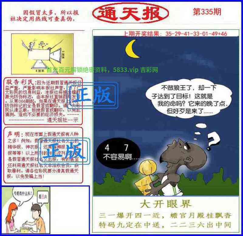 | 335期 | 羊虎鸡牛龙兔 | 狗44错 |